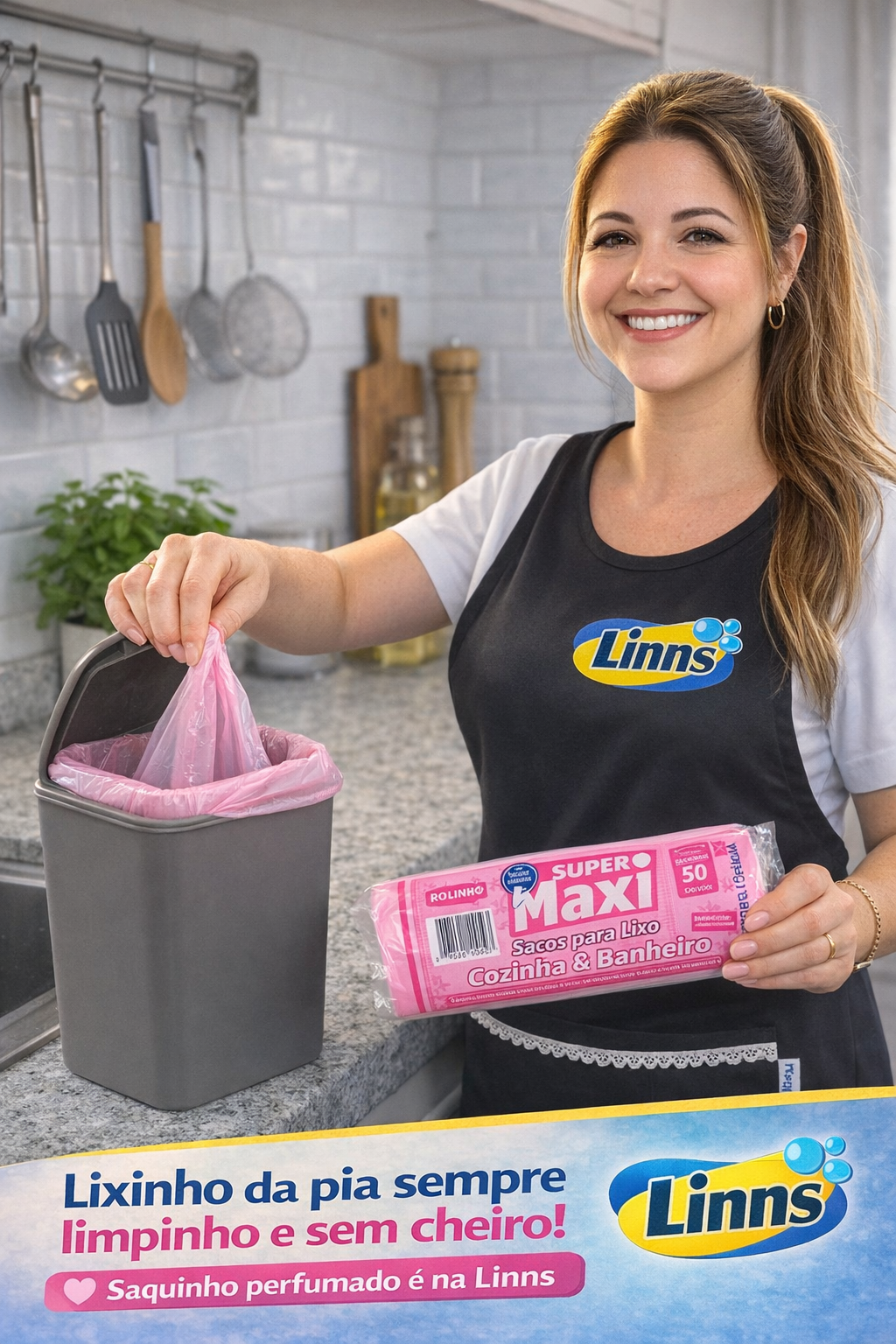 O “SACO P LIXO ROLINHO SUPER MAXI COZINHA E BANHEIRO PCT C 50 U” é um pacote de sacos de lixo pequenos (P) em rolo, com 50 unidades, projetado para lixeiras de cozinha e banheiro, sendo uma ótima opção para quem busca mais higiene e perfume.